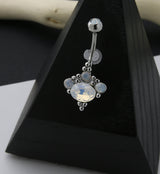 Decorative belly button ring that will catch your eye due to its shining synthetic opalite gems and pretty design. Size is 14G with a 7/16" 14mm barbell. It is made from 316L stainless steel. Externally threaded. Sold individually (1 pc). For healed piercings.