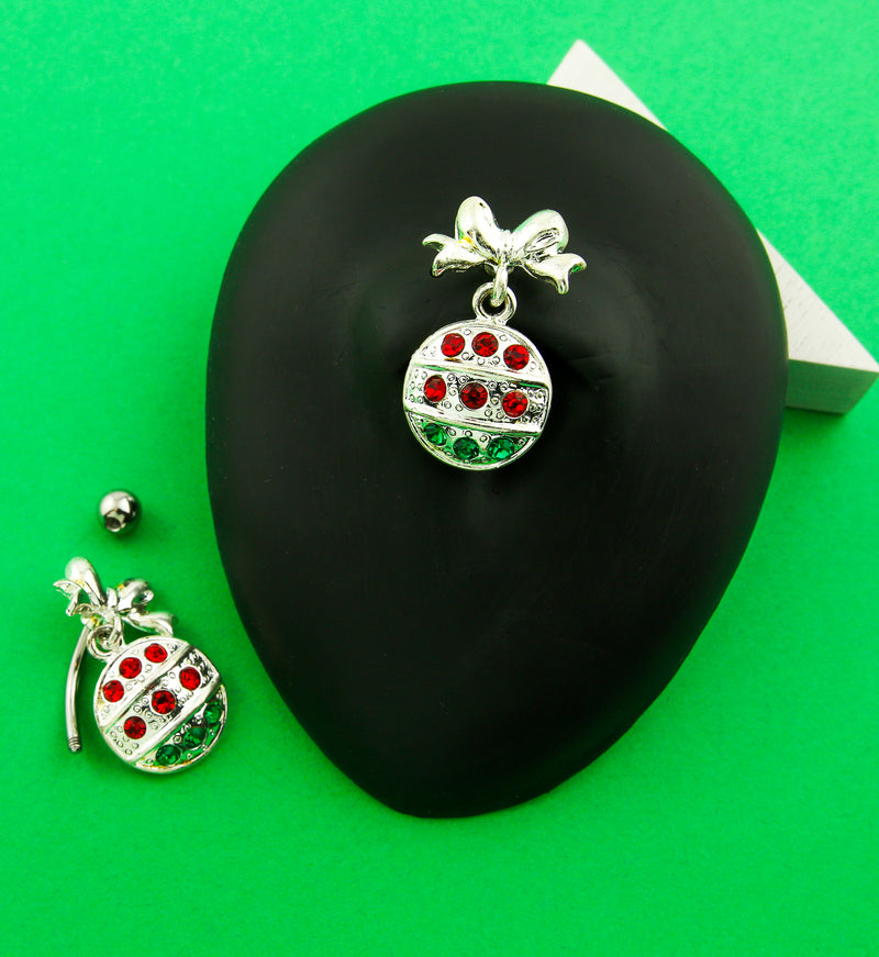 Festive belly button ring for your jewelry collection! Crafted with 316L stainless steel and featuring a 14mm, dangling tree ornament on top that is topped with a bow design. The ornament is filled with red and green cubic zirconia gems. This piece is designed to fit healed navel piercings and measuring 14G with a 7/16” (11mm) barbell length. Top bow measures 14mm x 9mm and the bottom ball measures 5mm. For healed piercings.