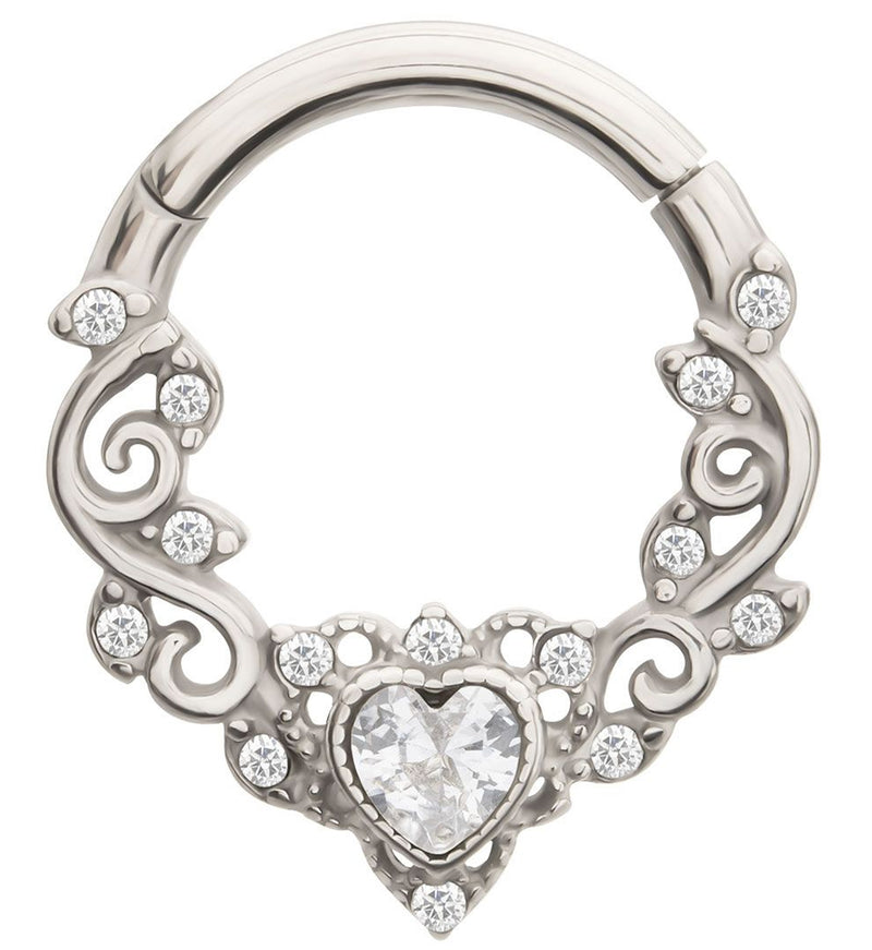 This hinged segment ring has a pretty, filigree design at the bottom that accented with clear cz gems and a heart-shaped clear cz gem in the center. Made from 316L stainless steel. Inner diameter size is 3/8" (10mm) with your choice of gauge size: 16G or 14G. The hinged design makes this piece effortless to put in and take out. Sold individually and meant for healed piercings.