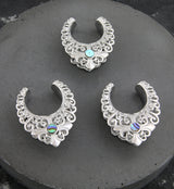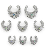Fun V-shaped saddles with an ornately decorated design and an accented abalone gem at the bottom. Made from 316L stainless steel. Available in sizes 0G (8mm) - 3/4" (19mm). Wearable area is about 5mm. Wear them on their own or wear them with ear weights to evenly distribute weight. Sold in pairs (2pcs).