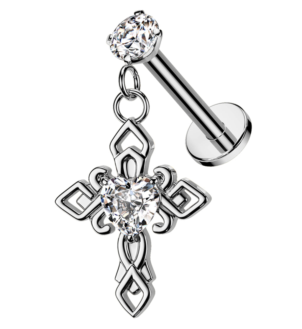 Ornate Cross Dangle Heart Clear CZ Internally Threaded Stainless Steel Labret