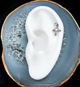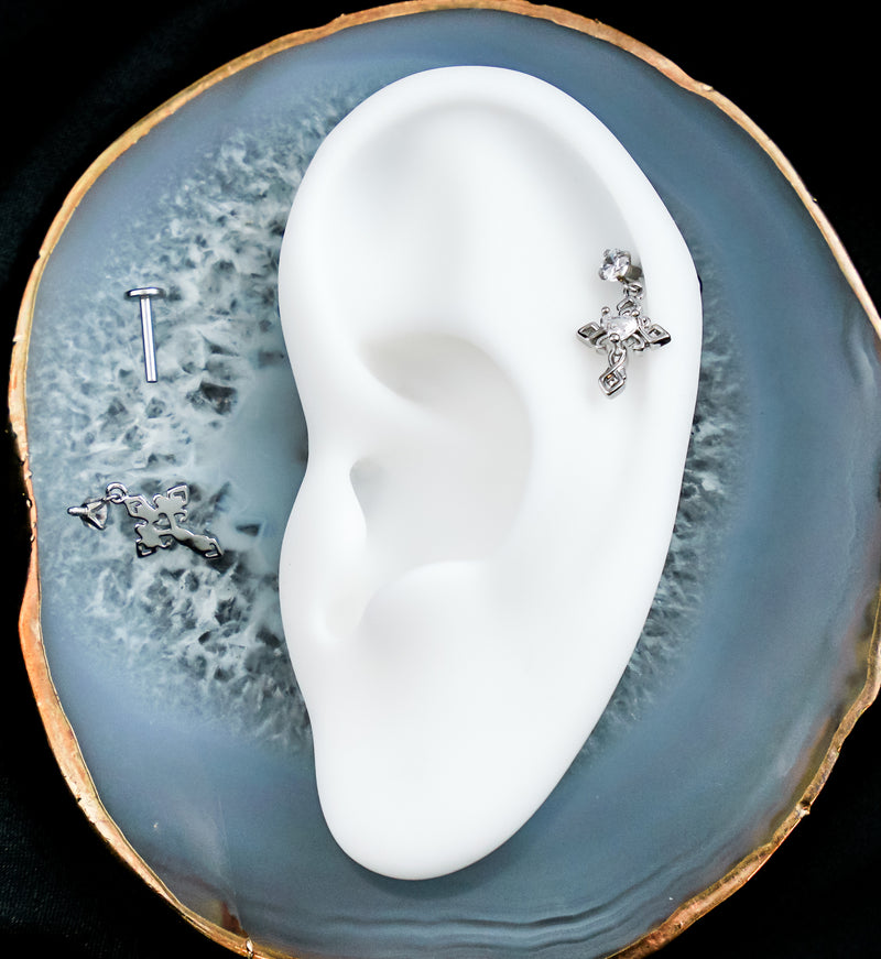 This internally threaded labret has a dangling, ornately designed cross that is accented with heart-shaped, clear cz gem in the center. It is attached to an internally threaded, prong set, clear cz gem. The flat back on the end measures at 4mm and the dangling design measures 13mm x 10mm. Size is 16G with a 5/16" (8mm) wearable length. It is made from 316L stainless steel. For healed piercings. Sold Individually.
