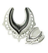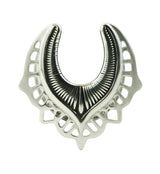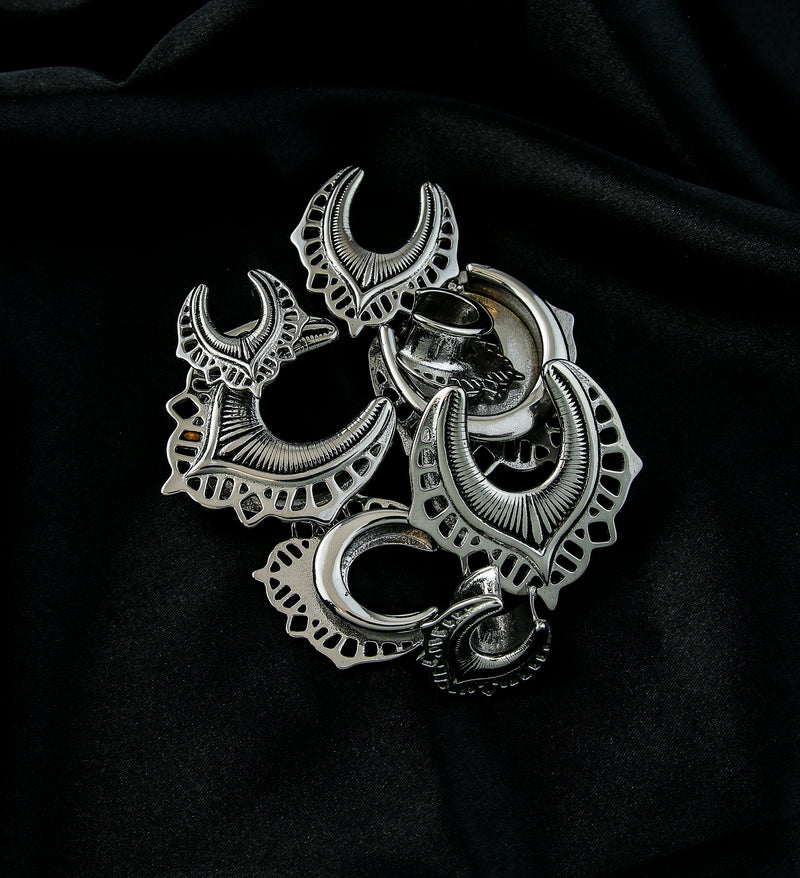 Stainless steel saddles with a pointed, ornately decorated shield design. Made from 316L stainless steel. Available in sizes 0G (8mm) - 1" (25mm). Wearable area is about 7mm with a full length of 10mm. Wear them on their own or wear them with ear weights to evenly distribute weight. Sold in pairs (2pcs).