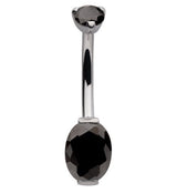Titanium belly button rings with black cz gems. The top cz measures 4mm and the bottom cz gem has an oval shape and measures 8mm. The bottom cz is sitting in a crescent moon shape so when seen from the side it looks like a half moon. Made from ASTM F-136 titanium and internally threaded. The wearable length measures 7/16" (11mm). Gauge size is 14G. Sold individually.