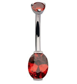 Striking belly button rings with garnet red cz gems. The top cz measures about 4mm and the bottom cz gem has an oval shape and measure about 8mm. The bottom cz is sitting in a crescent moon shape so when seen from the side it looks like a half moon. Made from durable ASTM F-136 titanium and internally threaded. The wearable length measures 7/16" (11mm). Gauge size is 14G. Sold individually (1pc).