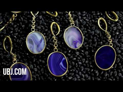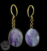 This pair of unique Oval Purple Line Agate Stone Brass Hangers weighs approximately 20 grams each and measures approximately 30mm wide by 40mm high. Each stone is slightly different in size and should be worn with a piercing 6G or bigger. Crafted with brass, these hangers are meant for short-term wear and can oxidize in extreme moisture conditions.