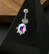 Mesmerizing belly button ring with a bottom design made up of an oval rainbow aurora gem that has accented clear cz gems around it. Size is 14G with a 7/16" 11mm barbell. It is made from 316L stainless steel. Externally threaded. Top cz measures at about 5mm. Bottom design is about 13mm x 12mm. Sold individually (1 pc).