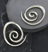These handmade Oviform Spiral White Brass Ear Weights of 9g each have a height of 36mm and width of 28mm, and are suitable for wearing with 4G (5mm) or larger piercing. However, brass is not recommended for extended periods of wear, and may oxidize in damp environments. Sold in pairs (2pcs).