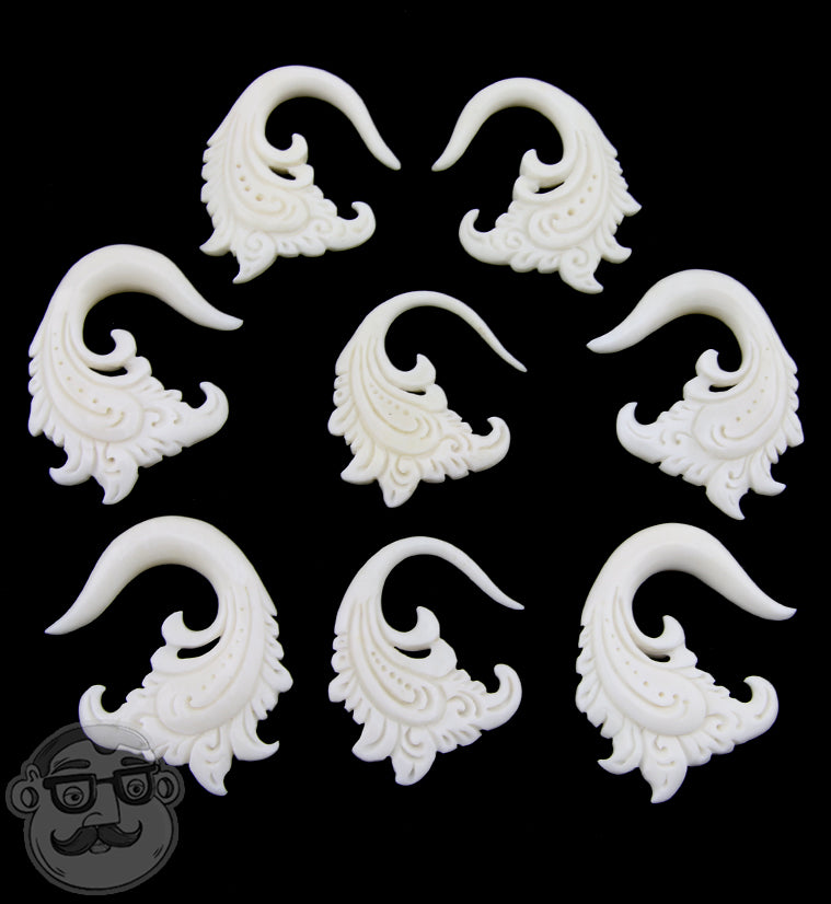Add a touch of natural charm with these Paisley Bone Hangers, sold in pairs and carved with a unique ornamental design. Handmade from sustainable water buffalo bone, each piece boasts its own distinct color and pattern, making your pair truly one-of-a-kind. Available in sizes from 12G (2mm) to 0G (8mm), these lightweight hangers are perfect for healed lobes. Please note, sizing may vary slightly due to their handcrafted nature. Keep them away from direct sunlight and moisture to preserve their beauty.