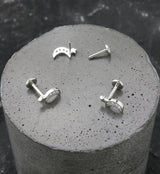 Threadless labret that consists of a crescent moon design that is filled with pave clear cz gems and an accented star. Made from 316L stainless steel. Size is 18G with a 1/4" (6mm) length. 4mm flat back. Top design measures at 8mm x 4mm. Sold individually (1pc).