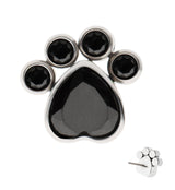 Threadless top made from ASTM F136 titanium in a cute paw print shape, filled with black cz gems. Sized at 7mm x 6.5mm. Fits all threadless posts. Pin size is 25G. Sold individually (1 piece - top only).