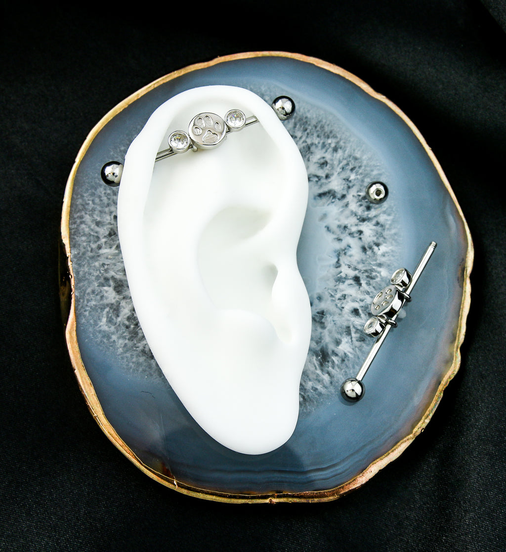 Industrial barbells with a paw print design that is accented with a 5mm clear cz gem on either side. Made from 316L stainless steel. Design is about 16mm x 8mm. Size is 14G with a barbell length of 1-1/4" (32mm). Externally threaded. Intended for healed piercings. Sold individually.