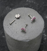 Threadless labret piece made from ASTM F136 titanium with a cute paw print shape. Complete with four, sparkling, pink cz gems along the top. Gems are about 2mm in size each. 2.5mm flat back. Size is 18G. Length is 5/16" (8mm). Sold individually (1 piece).