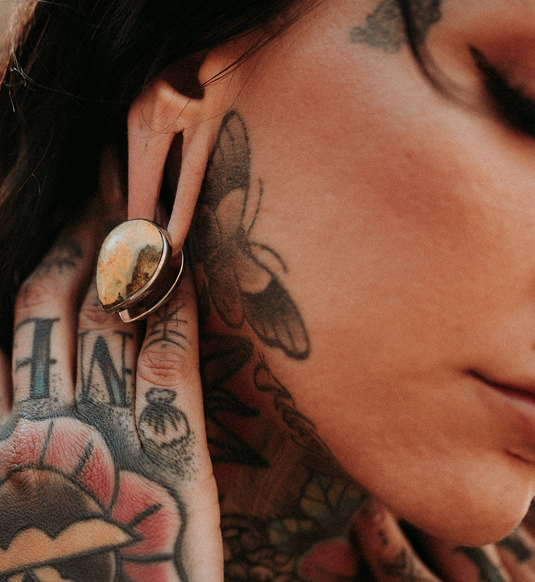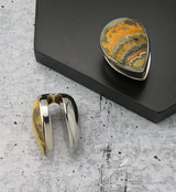 White brass ear weights in a teardrop shape and filled with natural bumblebee jasper stone in the front. Must be 13/16" (20mm) or bigger to wear. Height is 28mm and width is 20mm. Weight is approximately 27 grams each. Brass is not meant for long term wear and it may oxidize under extreme moisture conditions. Sold in pairs (2pcs). For healed piercings.