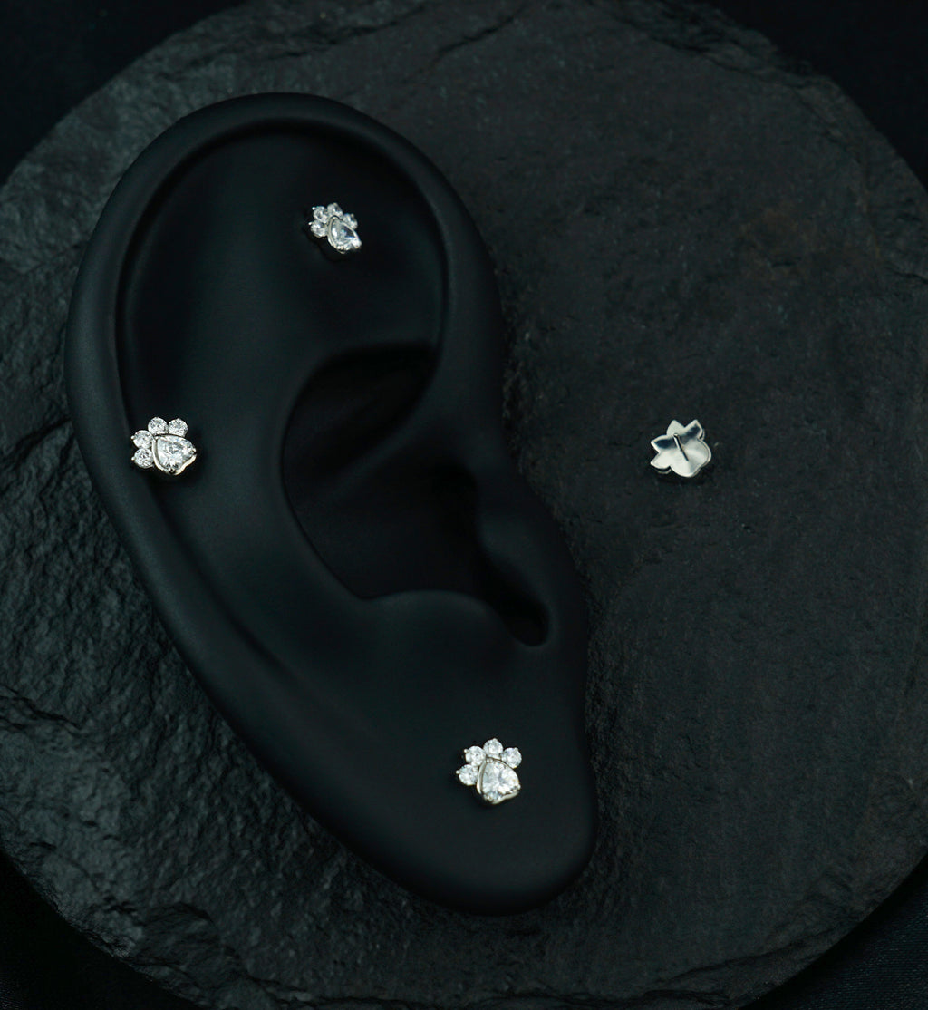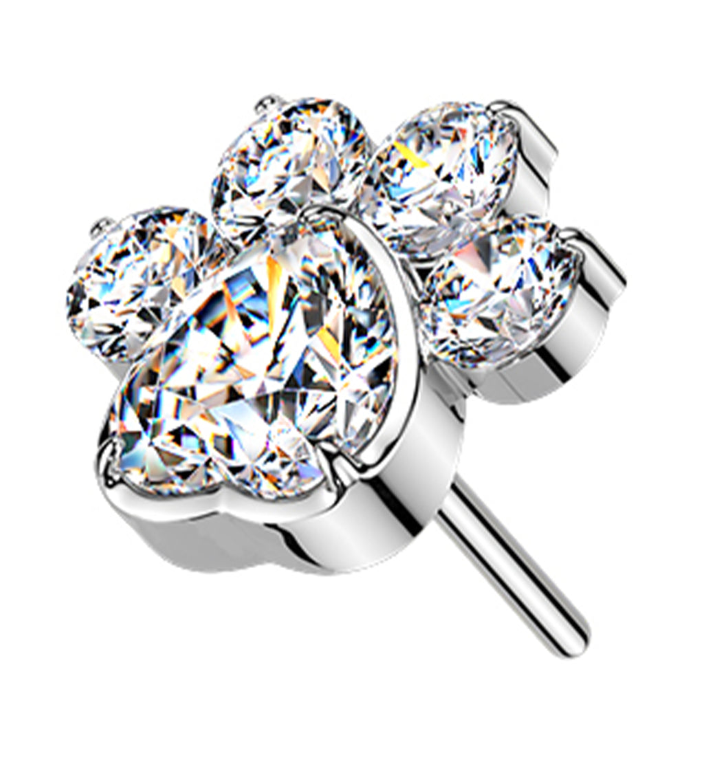 Add a playful touch to your cartilage or tragus piercing with this Pet Paw Clear CZ Threadless Titanium Top. It features durable ASTM F-136 titanium with sparkling, clear cz gems as the little pads of the paw. Sized at 5mm by 6mm and designed to fit most threadless posts, this 25G pin is sold individually (top only). Show off your love for furry friends with a fun, stylish accent piece!