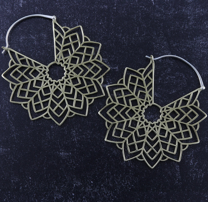 Sold in pairs (2pc) Size: 16 gauge Weight: 14 grams each Size: Height - 80mm X Width - 75mm Sterling silver clasp Double sided brass design Silver is not meant for long term wear May oxidize under extreme moisture conditions