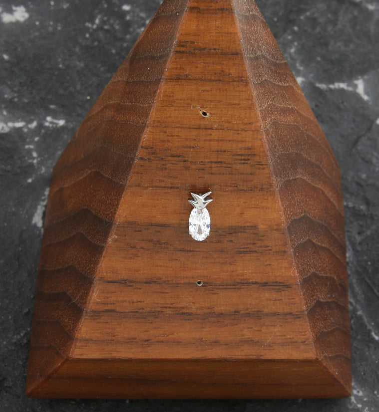 Threadless top piece that has a pineapple design that has an oval clear cz gem. Made from ASTM F-136 titanium. Measures about 6.75mm x 3.5mm. 25G pin. Fits most threadless posts. Sold individually (top piece only).