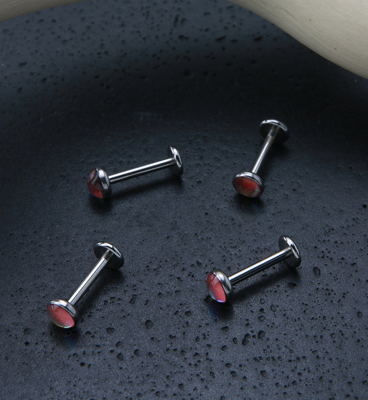 Pretty pink bezel set aura on top of a labret post made from 316 stainless steel. 4mm labret disk. 16G and internally threaded. Choose your size: 1/4" (6mm) or 5/16" (8mm). Sold individually. Recommended for healed piercings.