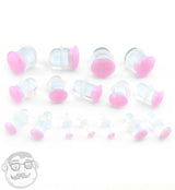 Made with borosilicate glass and double flares, our Pink Color Front Single Flare Glass have a light pink color on the front with a dome shape.They come in pairs with clear "O" rings for the backs and a wearable area of 12mm. Choose from sizes ranging from 16G (1.2mm) to 1/2" (12mm) to personalize your perfect fit.