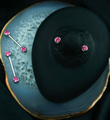 Threadless nipple straight barbells made from surgical 316L stainless steel. On each end there is a bezel set, pink cz gem measuring about 5mm. The threadless design makes it easy to insert and take out. Size is 14G with an inner barbell length of either 9/16" (14mm) or 5/8" (16mm). Sold in pairs (2pcs). For healed piercings.