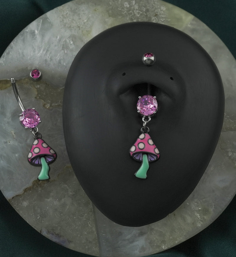 Pink Mushroom Pink CZ Stainless Steel Belly Button Ring