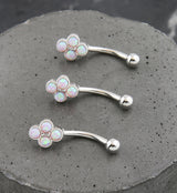 Curved barbell with a four bezel set opalite design on top made from synthetic pink opal gems. Pretty piece for your daith or eyebrow piercing! Made from 316L stainless steel and is 16G. Length is 5/16" (8mm). Externally threaded. Intended for healed piercings. Sold individually (1pc).
