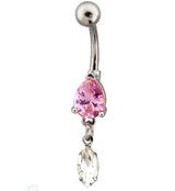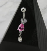 Sparkling belly button ring with a teardrop pink cz gem attached to a dangling clear cz gem. Size is 14G with a 3/8" 10mm barbell. It is made from 316L stainless steel. Externally threaded. Top ball measures at about 5mm and bottom is a 8mm teardrop shape. Bottom design is about 14mm. Sold individually (1 pc). For healed piercings.
