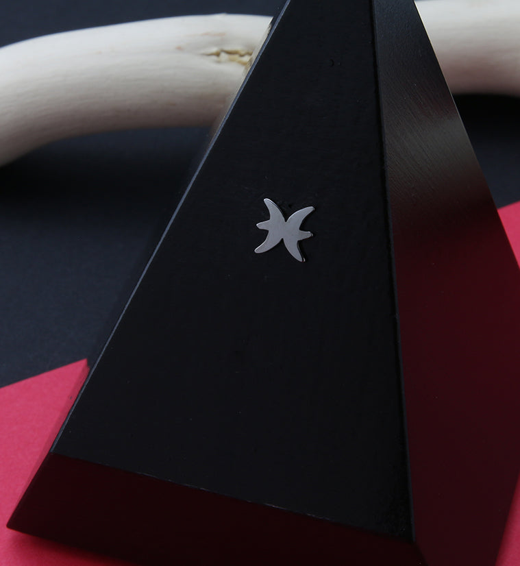 Threadless top piece in the shape of the pisces zodiac sign. Made from ASTM F-136 titanium. 25G pin, fits 10G-18G threadless posts. Top size is approximately 7mm x 6mm. Sold individually (top piece only).