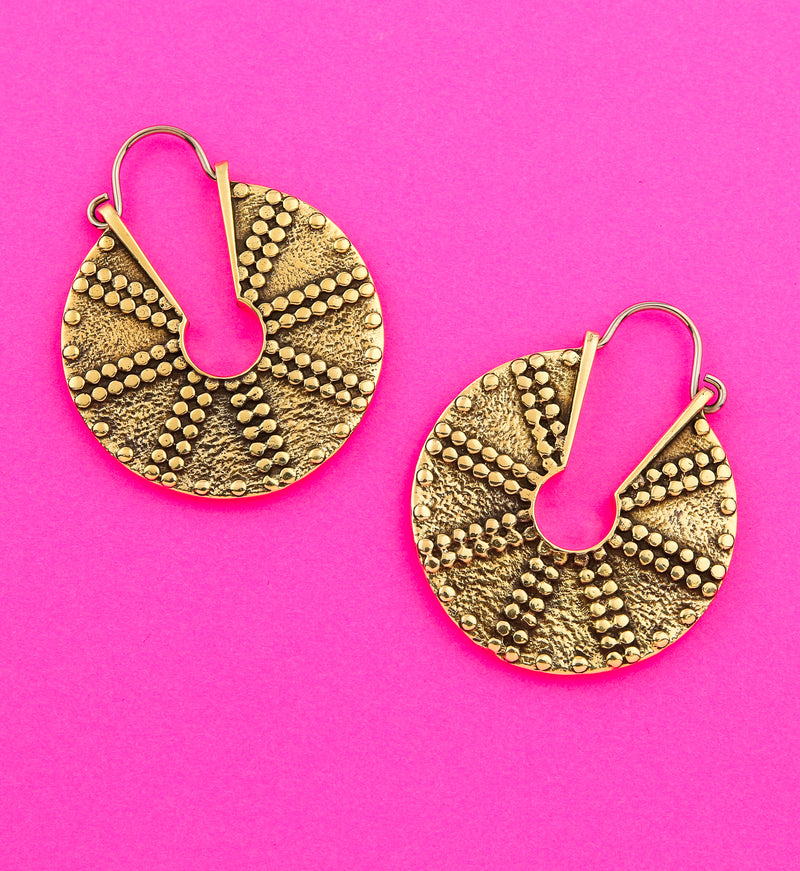 Be unique with these cool handmade Pivot Brass Disk Earrings/Hangers. Made from casted brass with a ASTM F-136 titanium wire, each piece weighs approximately 14 grams and measures 35mm x 42mm, but sizes may vary as each piece is unique. Requiring 18G (1mm) piercing for wear, the brass material is not meant for long term wear and may oxidize under extreme moisture conditions. Can be worn as regular earrings, plug hoops, or ear weights/hangers.