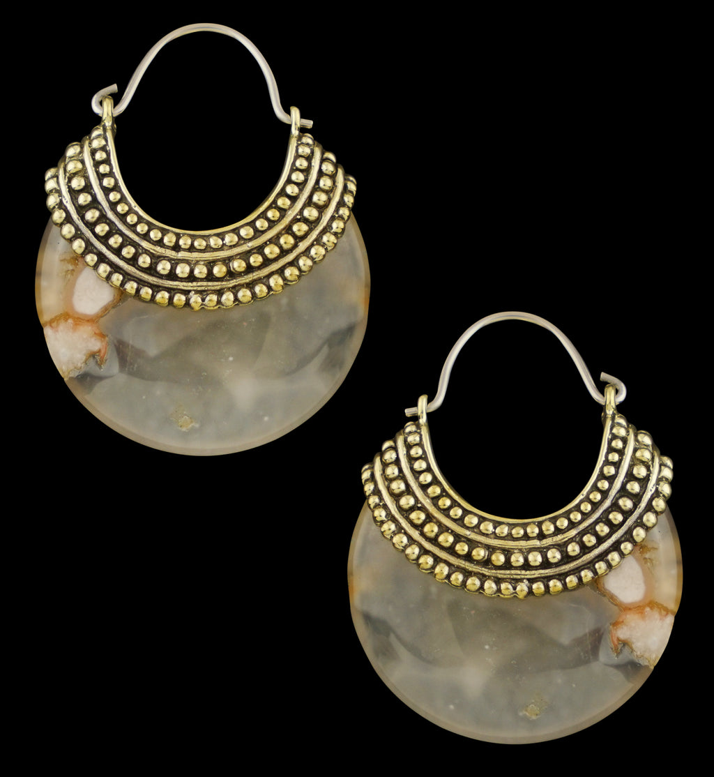 These brass earrings have beautiful patterns throughout due to the natural plume agate stone. Each piece measures 36mm x 30mm, give or take 1-2mm as these are handmade. Each earring weighs around 14 grams. Made from yellow brass with an astm f136 titanium 18G wire. Brass may oxidize in extreme moisture conditions. Sold in pairs (2pcs).