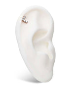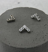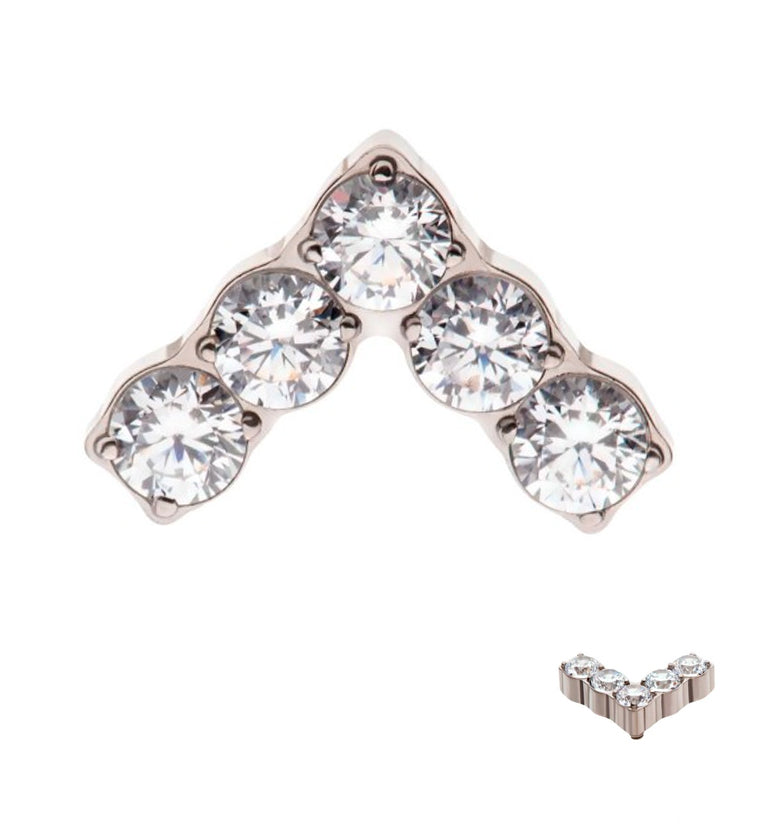 Lovely internally threaded top piece that has a v-shaped, pointed design and is filled with clear, round cubic zirconia gems. Made from ASTM F-136 titanium. Measures about 8.35mm x 5.75mm. M0.9 threading. Size 16G. Sold individually (top piece only).