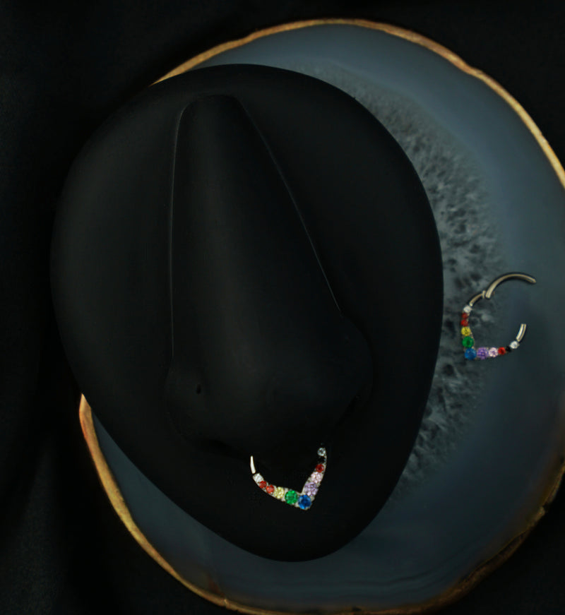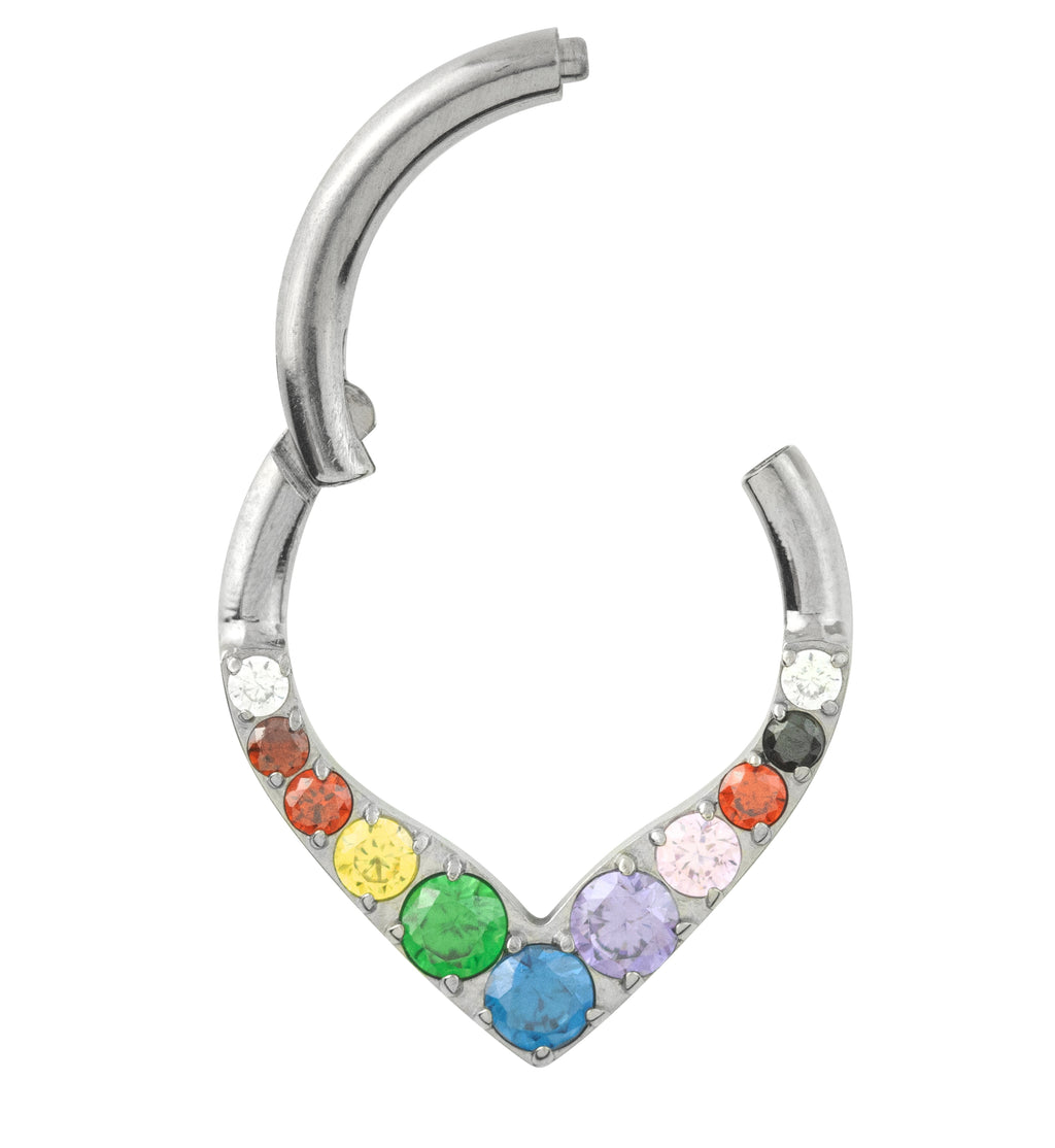 Hinged segment ring made from ASTM F-136 titanium with a hoop shape that is accented with rainbow cz gems along the bottom. Colors include: clear, red, orange, yellow, green, aqua, amethyst, light pink and black. Size is 16G with an inner diameter size of 5/16"(8mm). The hinged design makes this piece easy to put in and remove. Colorful piece for septum, cartilage or conch piercings! Sold individually. For healed piercings.