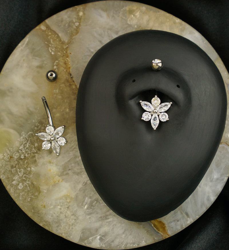 This belly button has a clear cz gem design in the shape of a brass flower. The gems alternate between round and marquise shaped. It is made from durable ASTM F-136 titanium and white brass. The top is externally threaded and the bottom design is fixed. The top bezel gem measures at 5mm and the bottom cz design measures at 12mm x 12mm. It is size 14G and has an inner length of 3/8" (10mm). Sold individually. For healed piercings. Brass is not meant for long term wear and may oxidize in extreme moisture conditions.