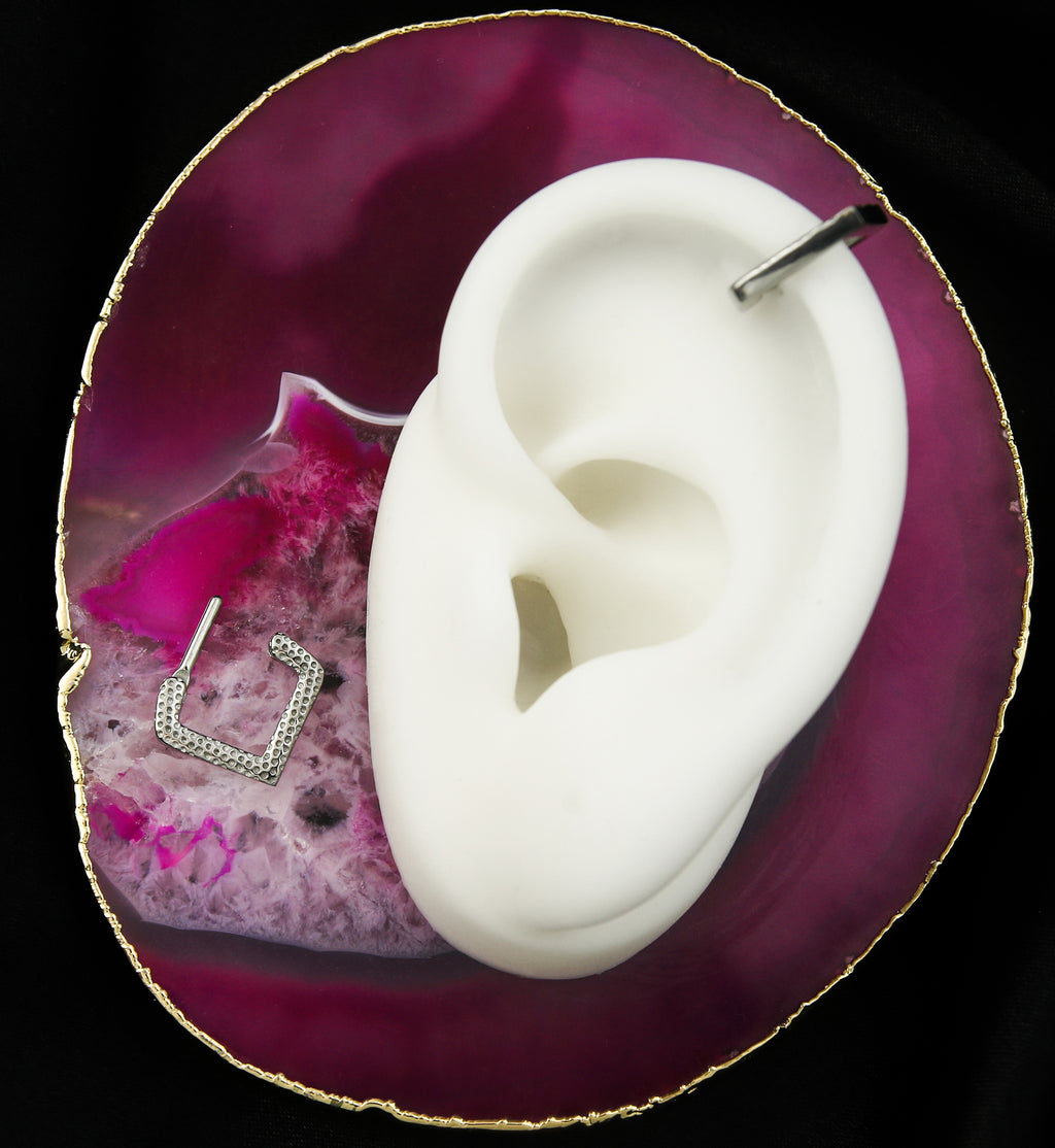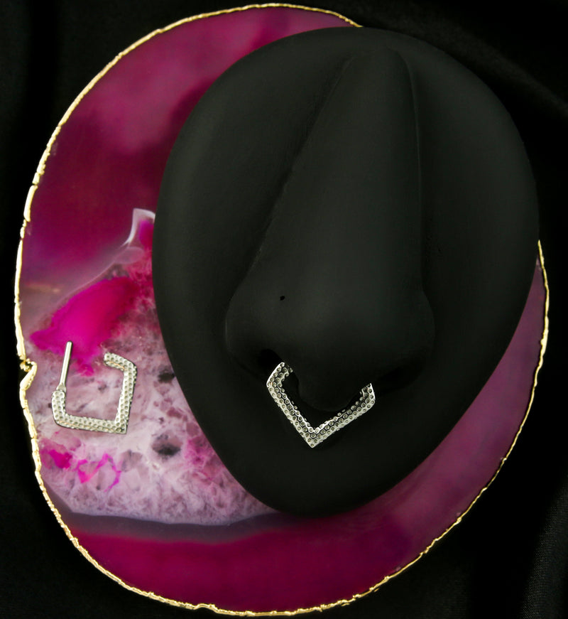 This fun 16G hinged segment ring has a cool honeycomb stamp design to it. It is made up of 316L stainless steel. Wearable size is 5/16" (8mm). The hinged design makes this piece effortless to put in and remove. Sold individually. Intended for healed piercings.