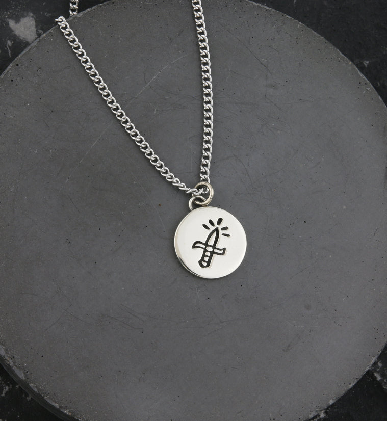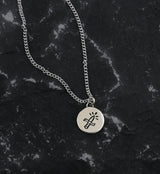 Curb chain necklace with a round charm attached that has an etched image of a dagger. Charm size is about 5/8" (16mm) in diameter. Made from solid white brass. The chain is made from 316L stainless steel. Choose your chain length from 16" (410mm) and 18" (460mm). Thickness is 0.8" (2mm). Sold individually (1pc).