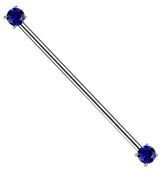 Add to your piercing with our double, prong-set, deep blue cz threadless industrial barbell! The 14g straight barbell is made from ASTM F-136 titanium and measures 1 ½”(38mm) total. This barbell is threadless for effortless wear and 4mm bezel-set, deep blue cz gem ends to finish. Sold individually (3 pcs - 2 gem ends, one barbell).