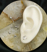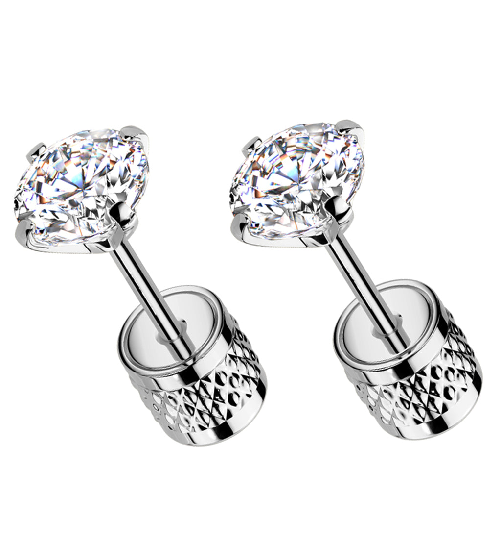 Stud earrings with a prong set, clear cz gem on top. On the back is a 5mm, textured, cylinder back. Made with surgical 316L stainless steel. Size is 20G with a wearable length of 1/4" (6mm). Choose your gem size from 3mm, 4mm, 5mm, 6mm, or 7mm! Sold in pairs (2pcs).