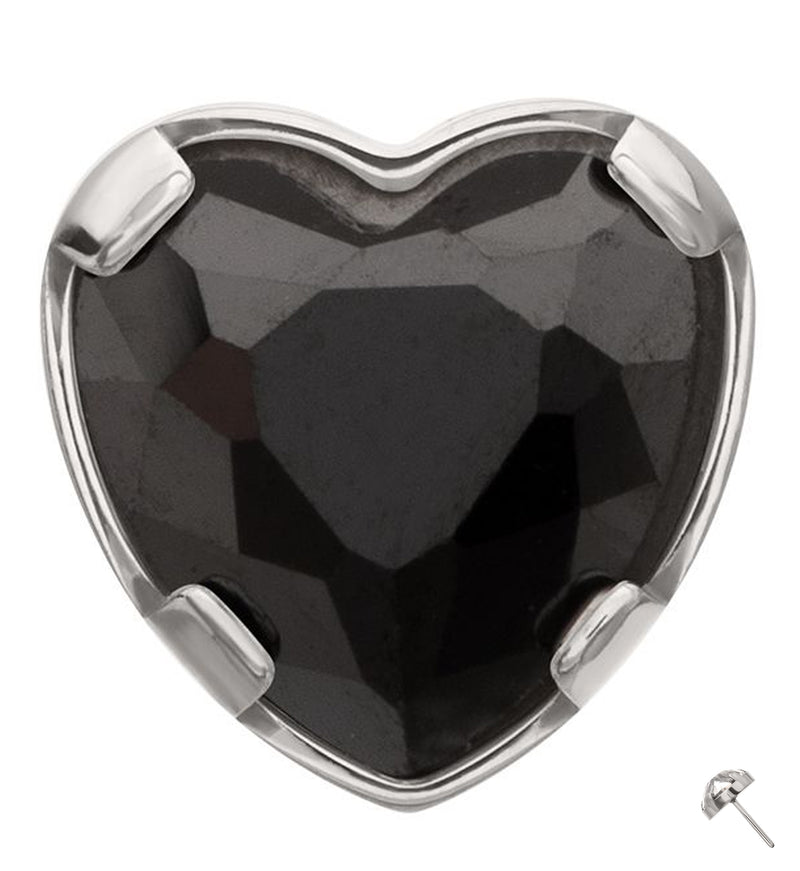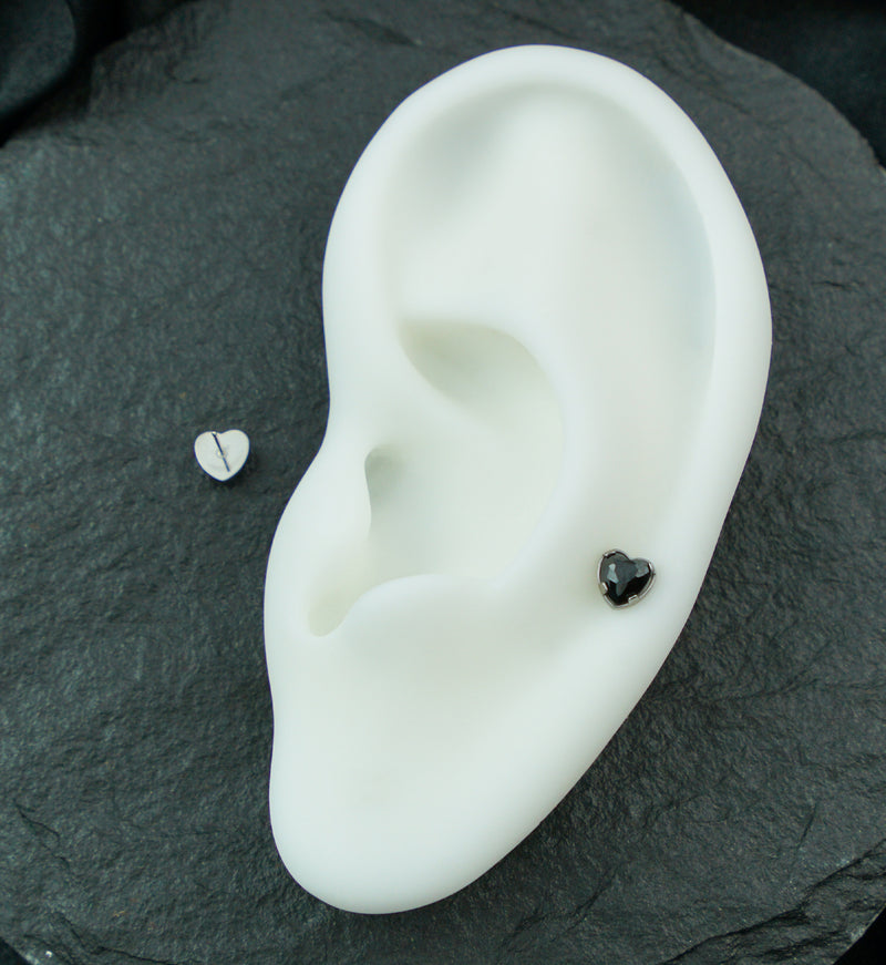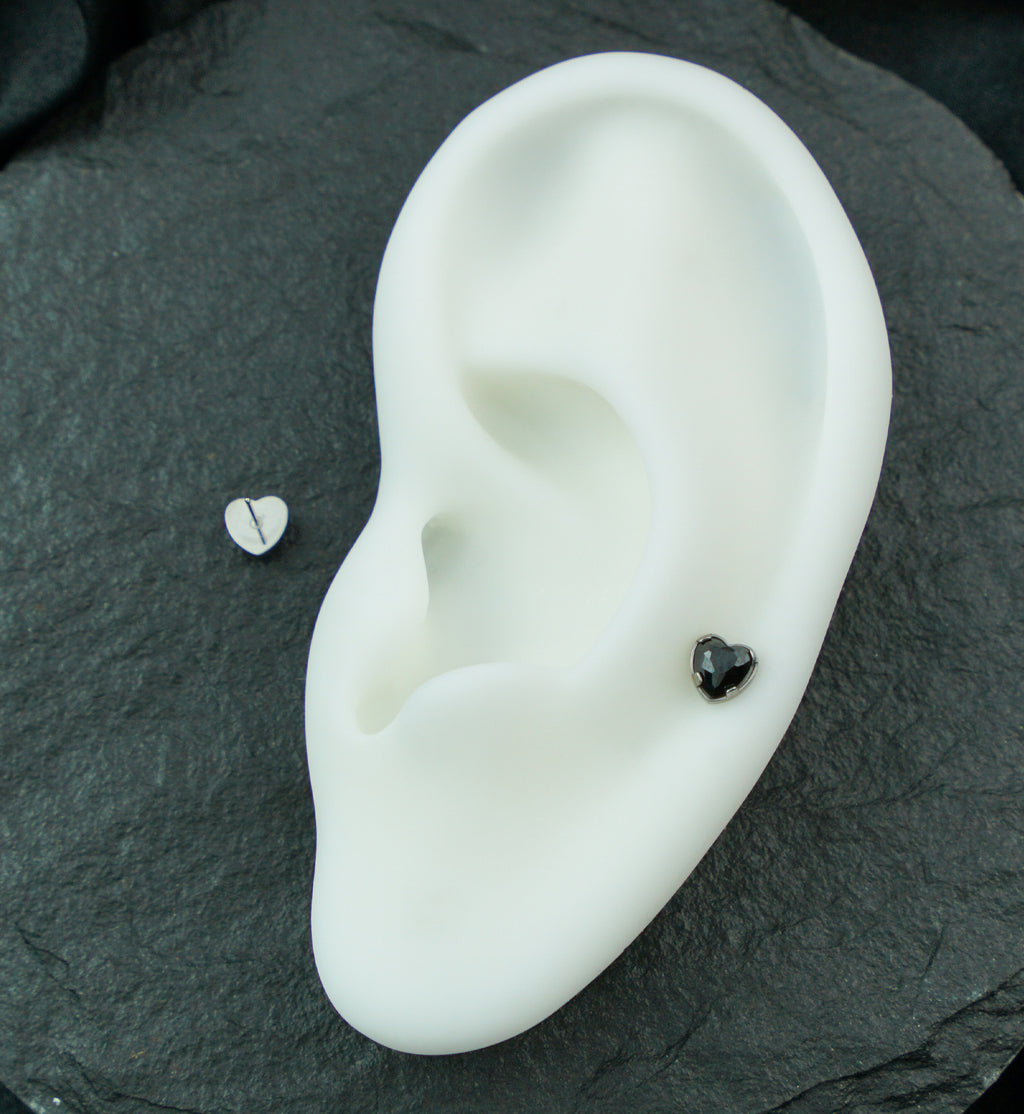 Threadless top piece that has a heart-shaped, black cz gem in a prong setting. Created from durable ASTM F-136 titanium. Measures 4mm. Fits most threadless posts as it has a 25G pin. Dark piece for your cartilage or tragus piercing! Sold individually (top only).