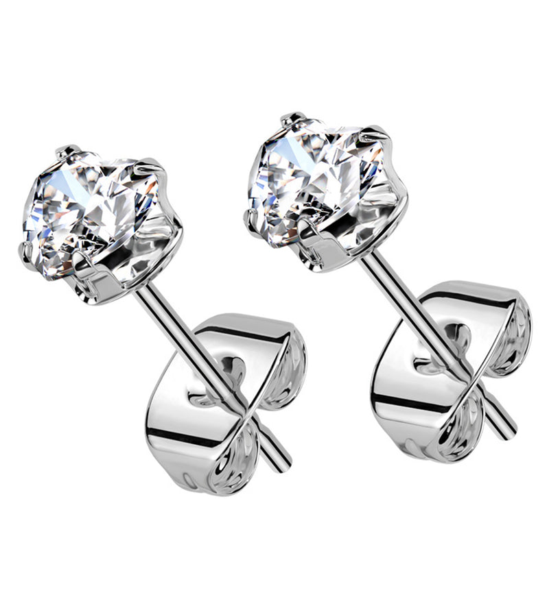 Stud earrings with a prong set, heart-shaped, clear cz gem on top. Made with surgical 316L stainless steel. Size is 20G with a length of about 5/16" (8mm). Multiple gem sizes available: 3mm, 4mm, and 5mm. Each piece has a stud design with a butterfly back. Sold in pairs (2pcs).