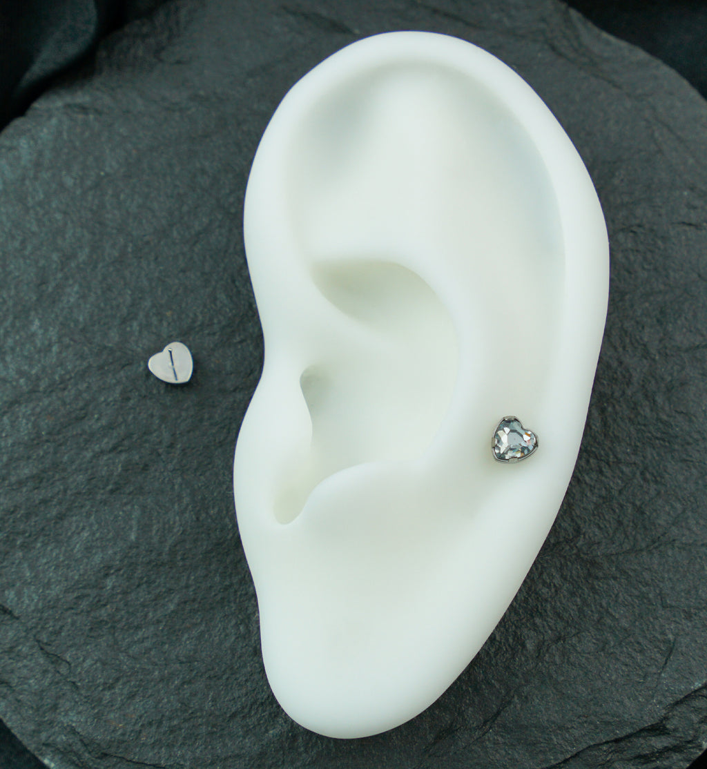 Threadless top piece that has a heart-shaped, clear cz gem in a prong setting. Made from strong ASTM F-136 titanium. Measures 4mm. Fits most threadless posts as it has a 25G pin. Sparkly piece for your cartilage, ear lobes or tragus piercing! Sold individually (top only).