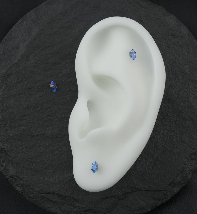 Threadless top piece that has a marquise, aqua blue cubic zirconia gem set in a prong setting. Created from strong ASTM F-136 titanium. The gem measures 5mm x 4mm. Fits most threadless posts as it has a 25G pin. Fun top piece for your cartilage or tragus piercing! Sold individually (top only).