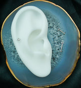 This internally threaded labret has a prong set, star-shaped, clear cz gem with a flat back. The disc on the end has a size of 4mm. Meant for healed piercings. Size is 16G and you can pick from two different wearable lengths: 1/4" (6mm) or 5/16" (8mm). The gem size on top is 3mm. It is made from strong ASTM F-136 titanium. Sold Individually (1 pc).