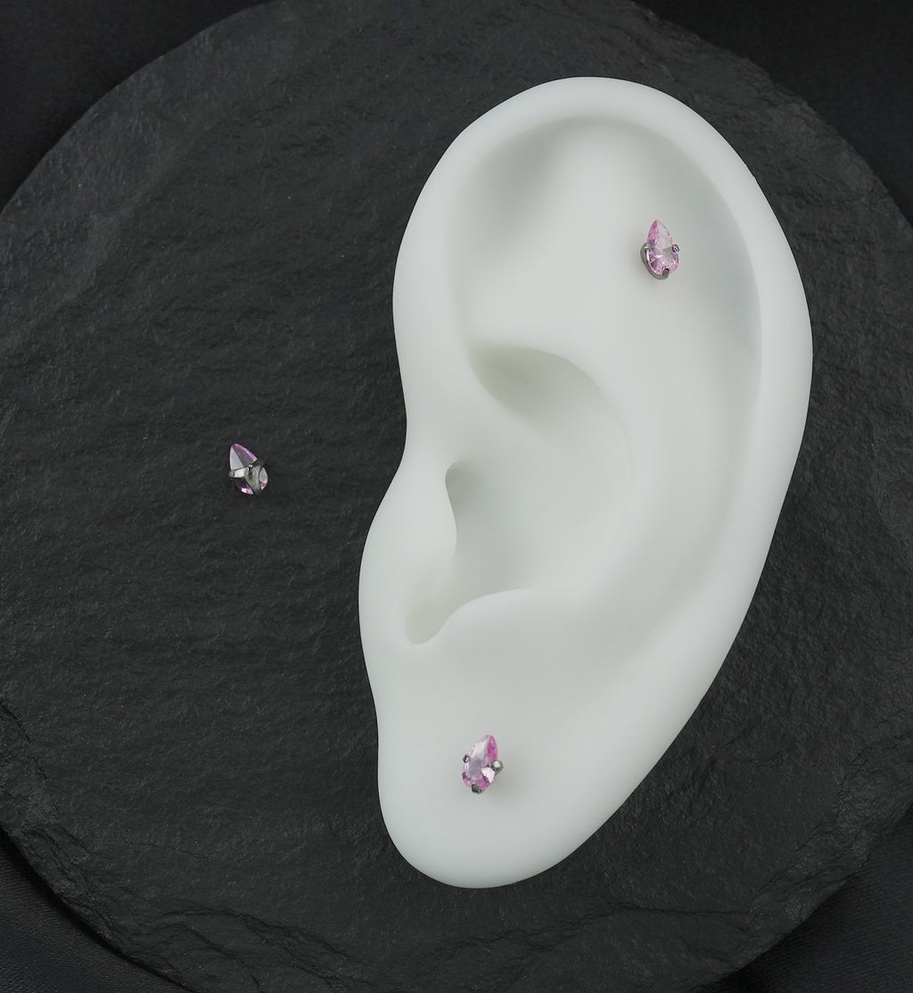 Pretty, threadless piece that has a teardrop, light pink cz gem set in a prong setting on top. Made from durable ASTM F-136 titanium. The gem measures 5mm x 4mm. Fits most threadless posts and it has a 25G pin. Cute top piece for your cartilage or tragus piercing! Sold individually (top only).