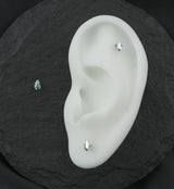 Colorful, threadless piece that has a teardrop, rainbow aurora cz gem set in a prong setting on top. Made from ASTM F-136 titanium. The gem measures 5mm x 4mm. Fits most threadless posts and it has a 25G pin. Fun top piece for your cartilage or tragus piercing! Sold individually (top only).