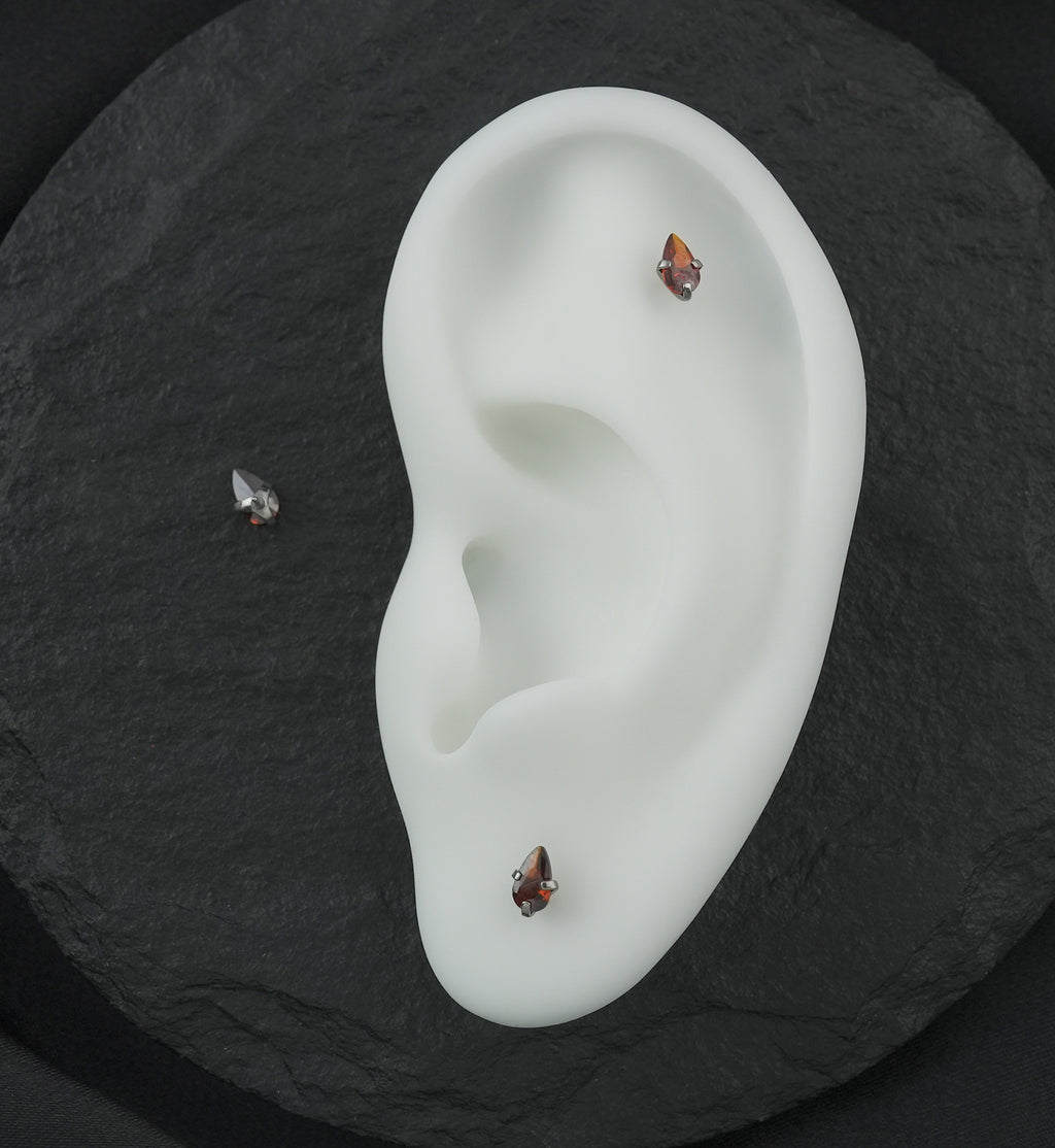 Threadless piece that has a teardrop, red cz gem set in a prong setting on top. Created from ASTM F-136 titanium. The gem measures 5mm x 4mm. Fits most threadless posts as it has a 25G pin. Striking top piece for your cartilage or tragus piercing! Sold individually (top only).