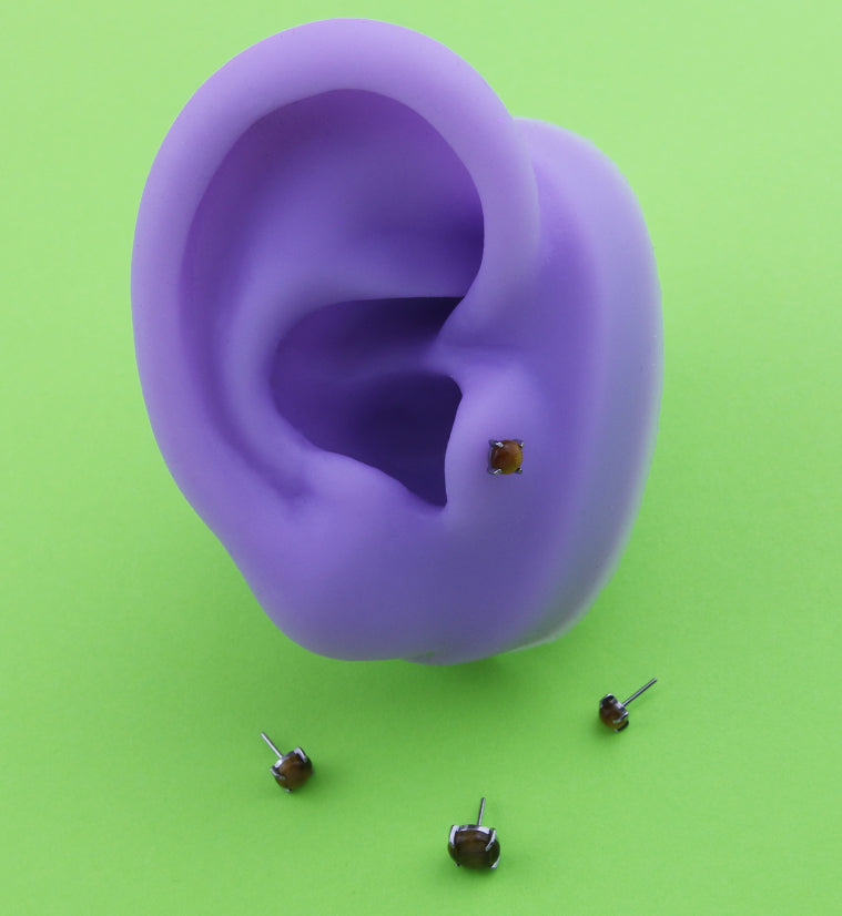 Prong set tiger eye stone tops that are threadless. They fit most threadless posts and are size 25G. Made from natural tiger eye stone and ASTM F-136 titanium. Pick your stone size from 3mm, 4mm and 5mm. Sold individually (1pc).