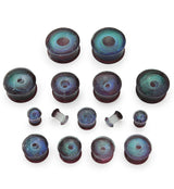 Dark purple glass plugs with a glittery green swirl in the center creating an eye look. Double flares. Handcrafted and polished. Pick your size from 2G (6mm) - 1" (25mm). Wearable area is 8mm. Full length (including convex dome front) is 12mm. Sold in pairs (2pcs).