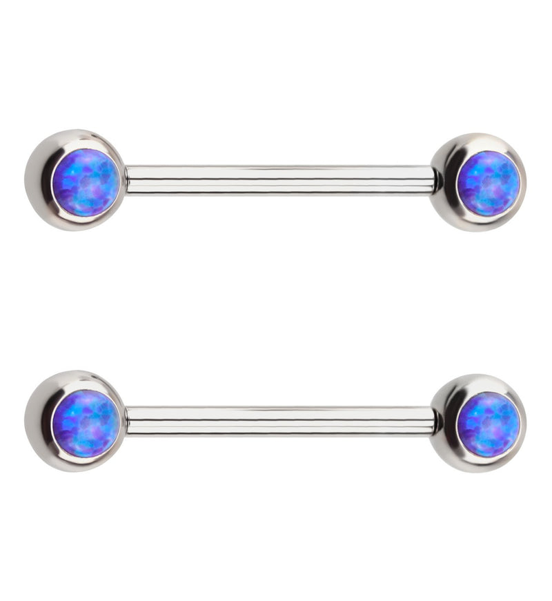 Threadless nipple straight barbells made from 316L stainless steel. On each end there is a bezel set, synthetic purple opal gem measuring at 5mm. The threadless design makes it easy to put in and remove. Size is 14G with an inner barbell length of either 9/16" (14mm) or 5/8" (16mm). Sold in pairs (2pcs). For healed piercings.