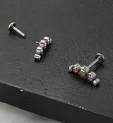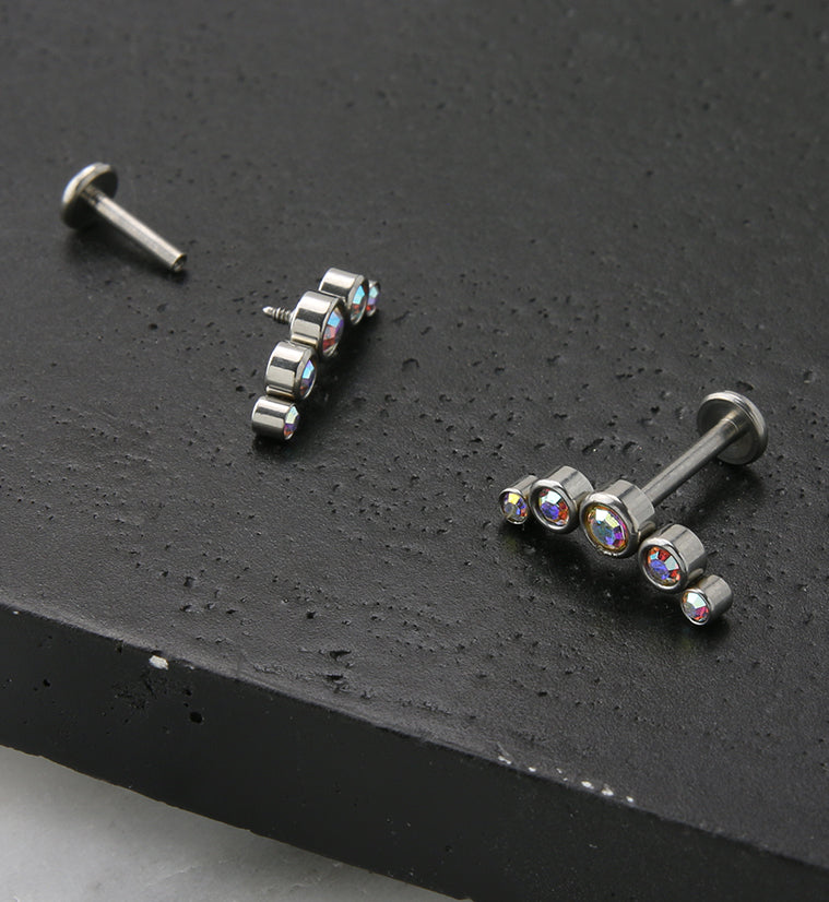 Colorful labret post made from 316L stainless steel with an arch of rainbow aurora cz gems. Size is 16G with an inner length of either 1/4" (6mm) or 5/16" (8mm). 3mm disk size. Top is approximately 12mm. Internally threaded. Sold individually (1pc).