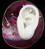 14G Rainbow Aurora Lotus is made from 316L stainless steel. The design (gem to gem) is about 16mm x 12mm. It features three 2mm rainbow aurora cz gems on each side. The barbell length of 1-1/4" (32mm). 5mm externally threaded balls. Recommedned for healed piercings. Sold as a set (3 barbell lengths included).